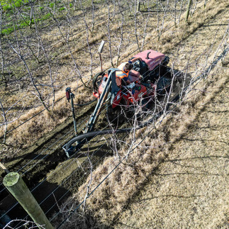Using our smaller trencher, narrow and accurate trenches were cut through the rows. Guided by a laser auto-level, each pipe was laid at the correct fall for consistent water flow. Perforated pipe was installed, backfilled with graded stone, and covered with soil to leave a smooth, tidy finish.